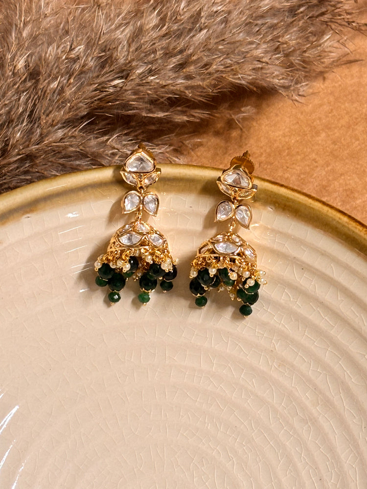 These Polki Jhumkas feature stunning green beads that provide a vibrant contrast to the traditional Polki detailing. Handcrafted with intricate design work, they add a touch of elegance and color to any outfit, making them an ideal choice for festive occasions and special celebrations.