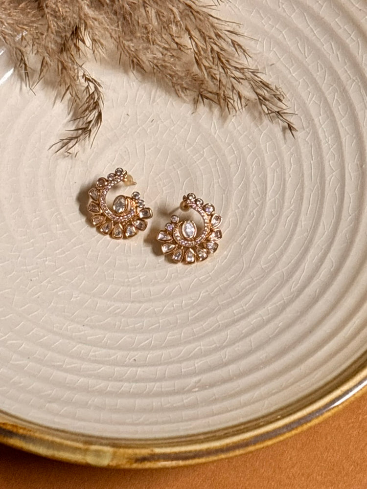 These small earrings feature a variety of unique shapes with plain Kundan and Polki accents. Handcrafted to showcase versatile elegance, they add a subtle touch of sophistication and can effortlessly elevate any outfit with their classic charm.