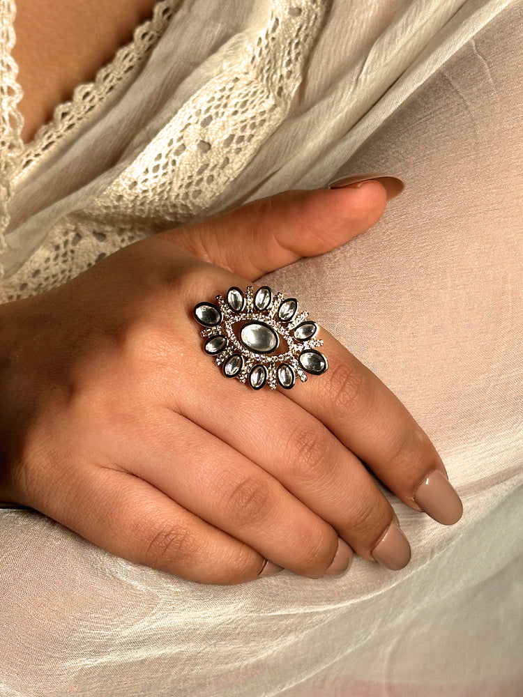 Elegance in simplicity. Nayra features a polished Kundan setting with uncut Polki stones, creating a minimalist yet sophisticated design. A timeless treasure that brings understated luxury to your hand, ideal for daily wear or subtle celebration.