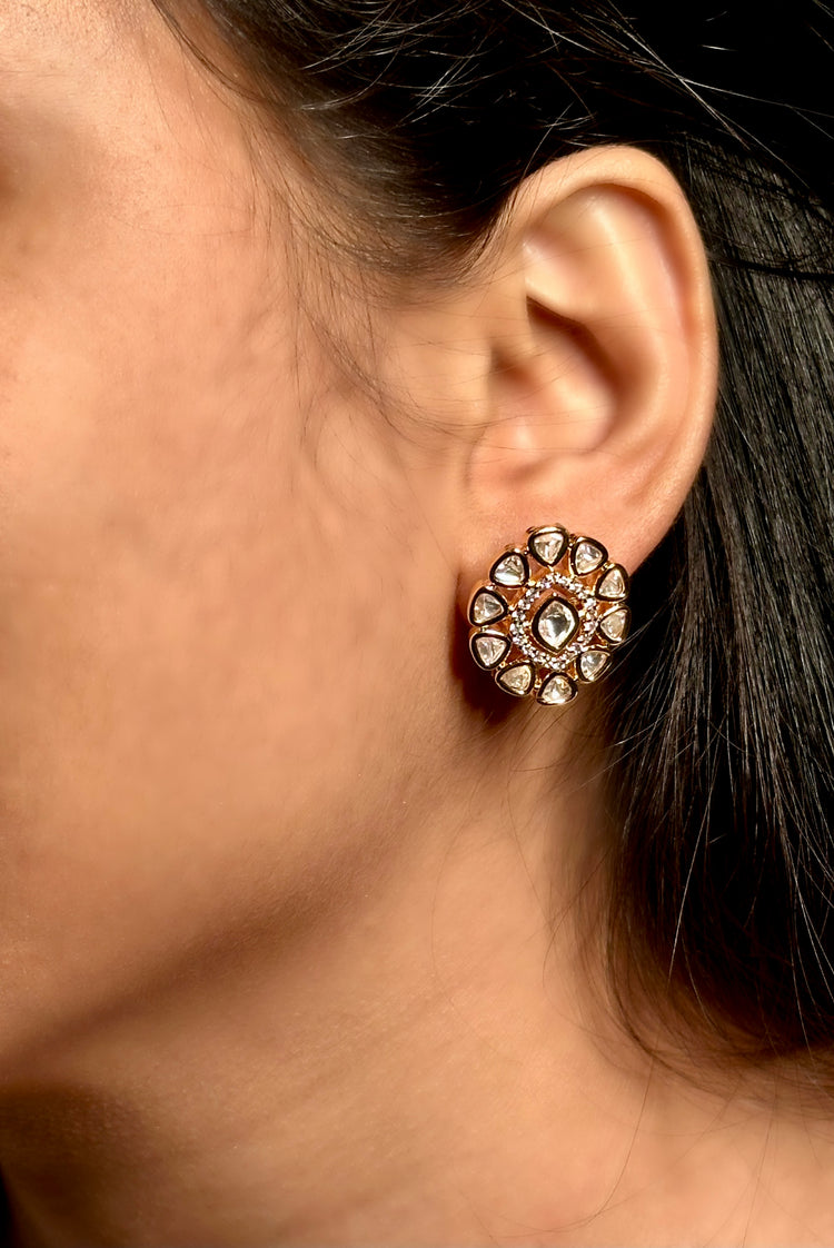Understated yet regal, Noorika Polki studs bring the luminous charm of traditional Indian craftsmanship to a minimal silhouette. Featuring uncut Polki diamonds set in handcrafted Kundan frames, these earrings capture light with every angle—glowing softly like moonlight on gold. Perfect for both everyday elegance and traditional grace.