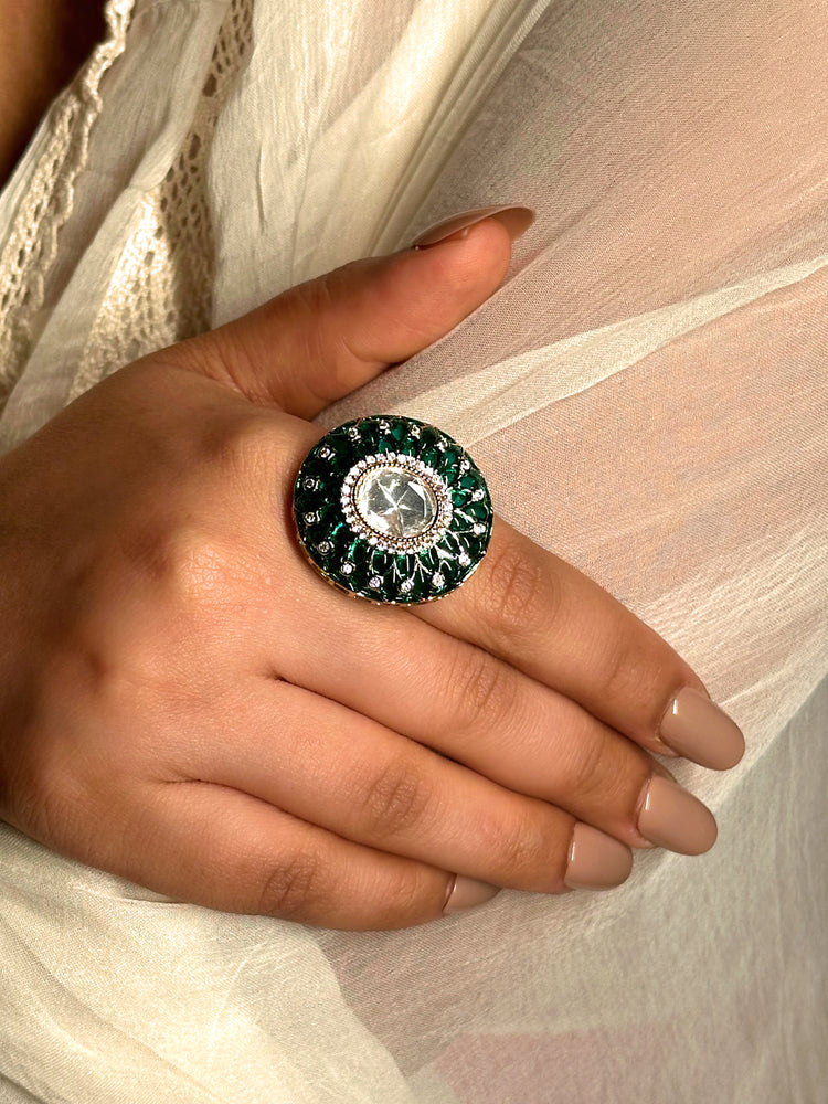 A radiant fusion of emerald brilliance and Kundan craftsmanship, Zarima is a statement of royal elegance. This round emerald ring, with Kundan accents in between, brings a touch of regal charm to any ensemble, perfect for weddings or special occasions.
